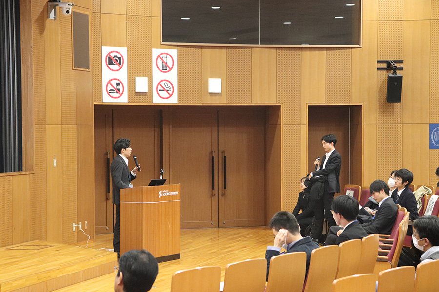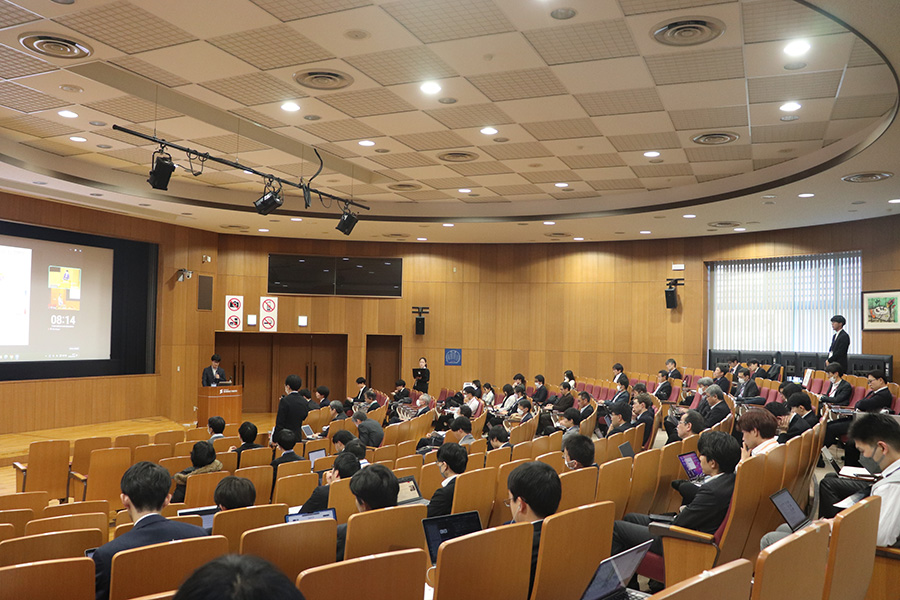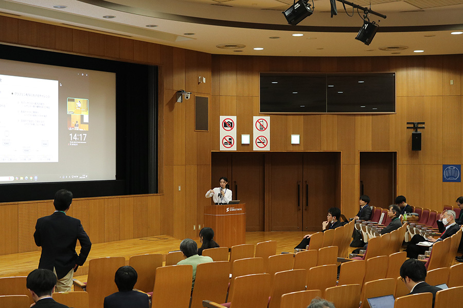 第2部では、物質・情報卓越教育課程の博士後期課程2年の学生が自主設定論文に関する進捗の発表を英語で行いました。自主設定論文は、自らの博士論文研究とは異なる課題を自主的に設定して研究します。自ら設定した課題に対し、専門分野の枠を超え、物質と情報を用いた複素的な新しい考え方を持つ独創的な研究を自立的に行う能力を身につけることが目的です。教育課程の登録学生は、博士後期課程2年の6月か12月の成果発表会にて、英語で研究の進捗状況を発表した上で、博士後期課程修了時までに、実施した研究結果を論文にまとめます。今回は今年度発表を行う予定の博士後期課程2年生のうち22名が発表を行いました。