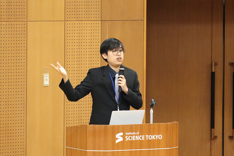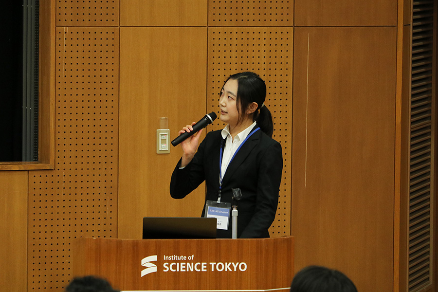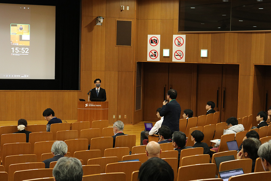 物質・情報卓越コースおよび物質・情報卓越教育課程では、12月9日および12月10日に、成果発表会・中間発表会を大岡山キャンパス ディジタル多目的ホールで開催しました。この発表会には、物質・情報卓越コースおよび物質・情報卓越教育課程に登録する学生が参加し、物質・情報卓越コースの学生は中間発表会として、物質・情報卓越教育課程の学生は成果発表会として研究成果を発表する場となりました。開催形式は対面とZoomを併用したハイブリッド形式で、本コースの連携協力機関である企業関係者や本コースの担当教員、物質・情報卓越教育課程のプログラム担当教員、学生など、学内外から約130名が参加しました。